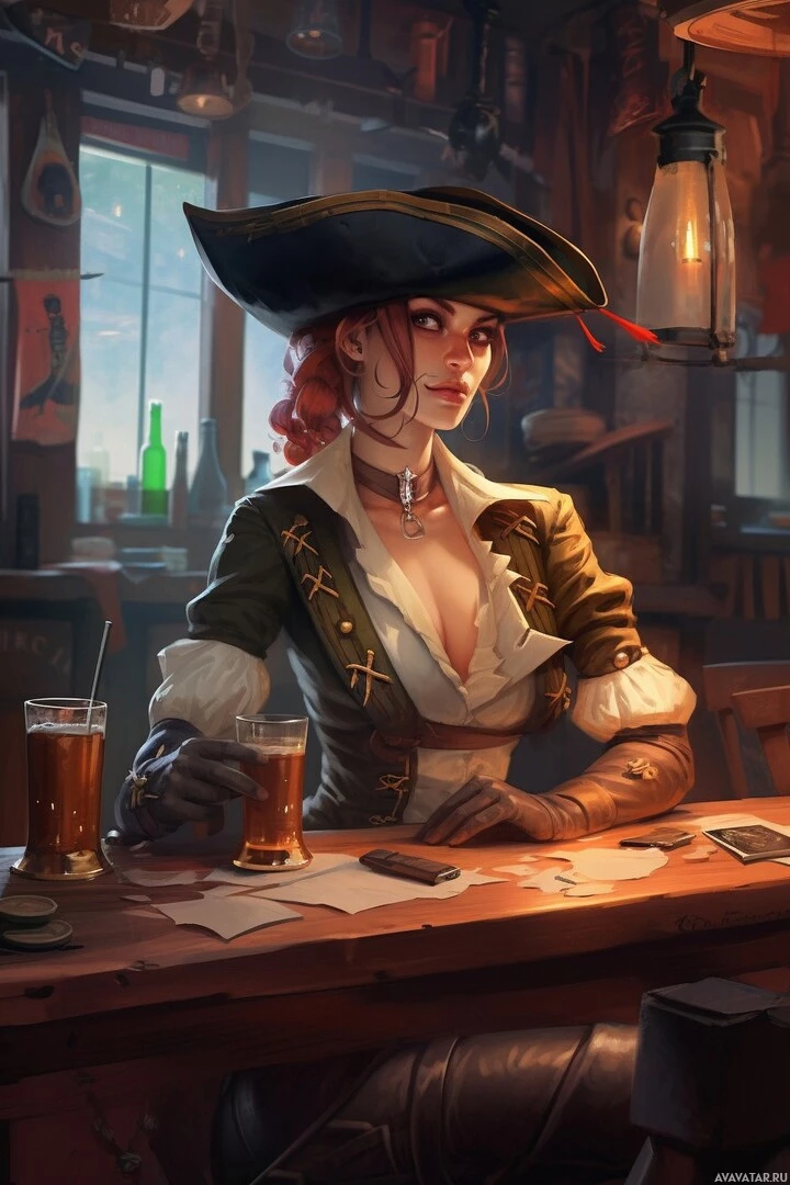 red hair and is wearing a tricorne hat, which is commonly associated with pirates. In her hand, she holds