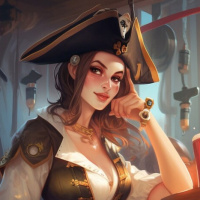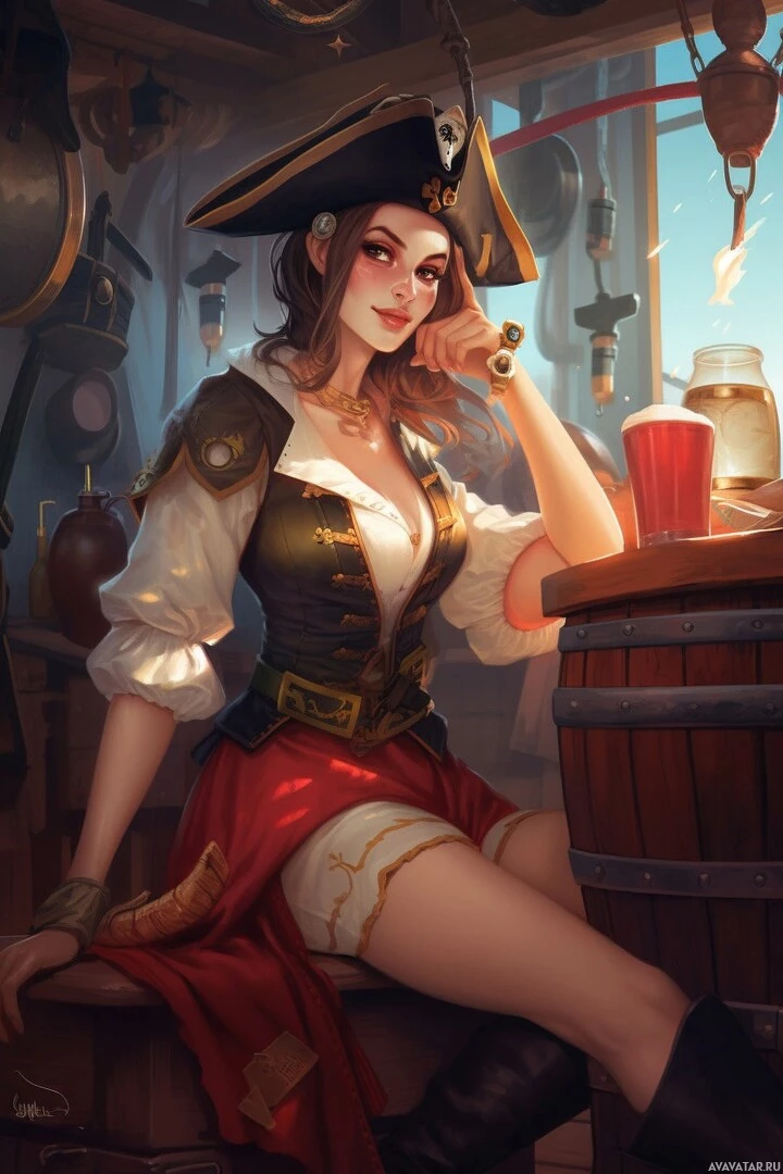 pirate attire. Her pose suggests she is sitting comfortably with her chin resting on one hand, holding what appears to be a bottle or container in the other. The background of the image depicts