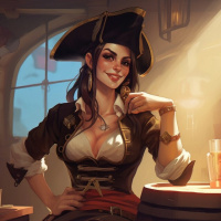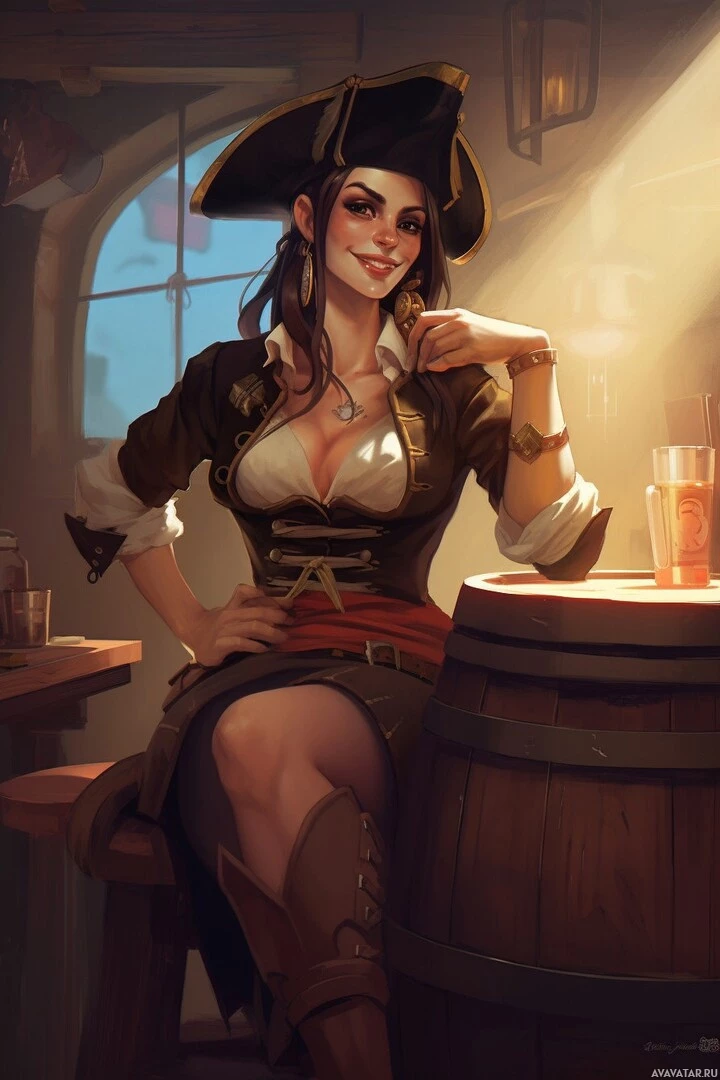 a female character dressed as a pirate. She is wearing a tricorne hat and has