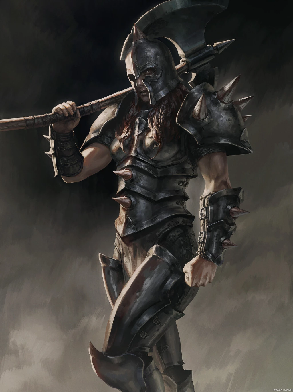 На этом изображении изображен персонаж-воин, вероятно, из жанров фэнтези или исторической фантастики. Персонаж одет в доспехи и держит топор, что говорит о том, что он опытный боец. Поза фигуры создает ощущение готовности к битве.