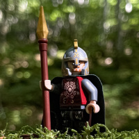 The image shows a Lego minifigure resembling a warrior or knight, standing in what appears to be a natural, mossy
