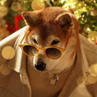 The image shows a dog dressed in sunglasses, clothes that resemble