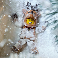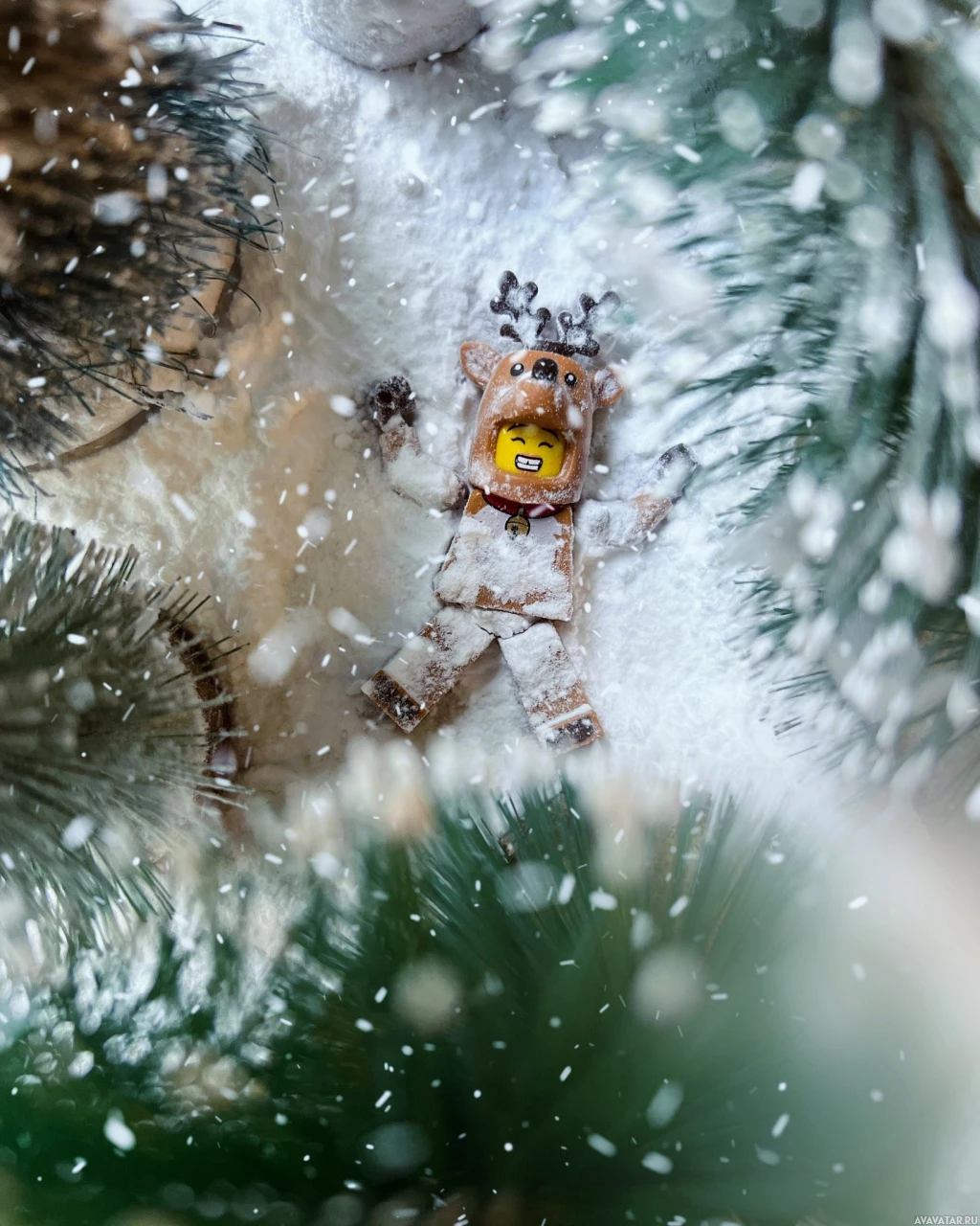 Lego figure is designed to resemble an astronaut or explorer, complete with a space suit and backpack. The overall setting creates the impression of a fun, whimsical holiday decoration where a child might have set up their