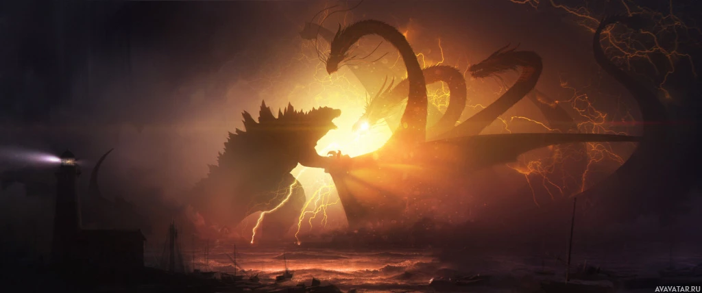 lightning bolts in the sky. There are also other monsters visible, hinting at the presence of other kaiju creatures from