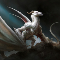 a majestic creature with large wings, scales, and a long tail. The dragon appears to be sitting on a rock or an outcropping in what could be described as a dramatic or otherworldly setting, possibly a scene from