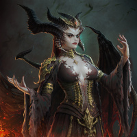 the Diablo universe. She has horns, wings, and a menacing presence that is typical of demons or evil characters in