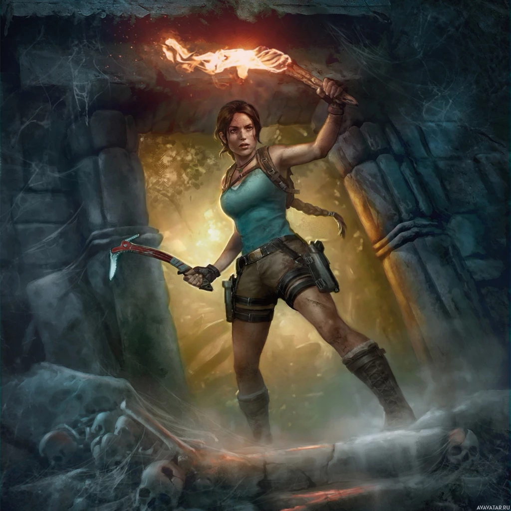 the video game Tomb Raider, known as Lara Croft. She is depicted holding a torch in one hand and a weapon with a rope attached to it in the other hand, suggesting an adventurous or action-oriented theme consistent with her character's exploration of ancient ruins and tombs in