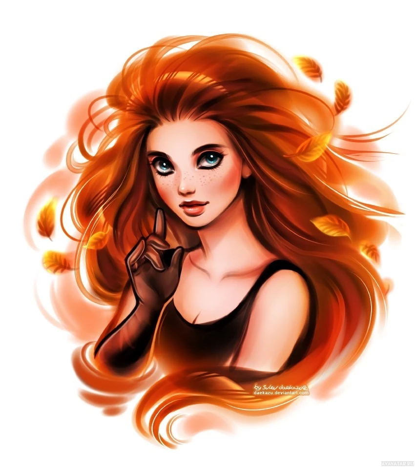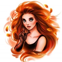 autumn leaves that are floating around her head, which adds a whimsical or ethereal feel to the image. The overall style of the illustration is cartoonish with a soft color palette dominated by