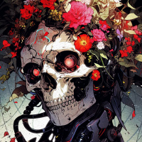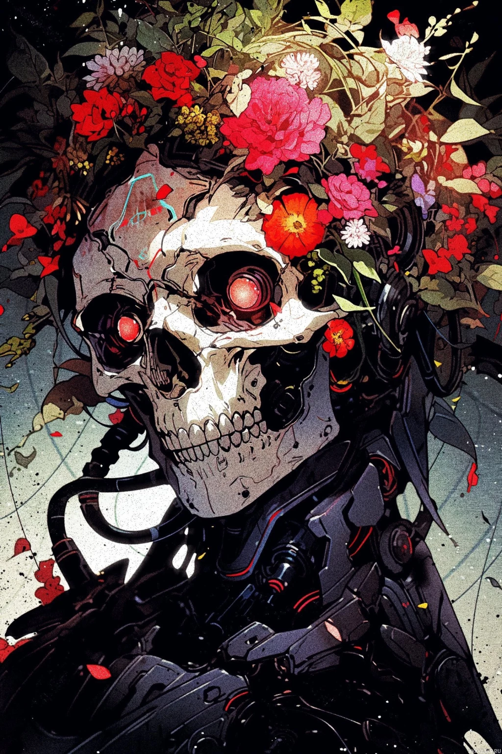 The image depicts a stylized representation of a humanoid figure with a skull for a head and robotic features. It is adorned with flowers, which adds a touch of nature to the otherwise mechanical appearance. This artwork combines elements of science fiction with floral motifs.