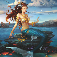 a fish tail, indicating her mermaid nature. The surrounding environment is vibrant and detailed, with various