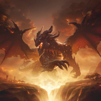 a fantasy scene with a dragon at its center. The dragon is portrayed in a menacing manner, possibly representing a character or creature from a fantasy setting such as