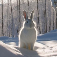 The image depicts a rabbit standing amidst snow-covered trees. It appears to be a clear day with the sunlight streaming through the branches, casting a warm glow on the scene. There's no indication of human presence or any other animals in the photo.