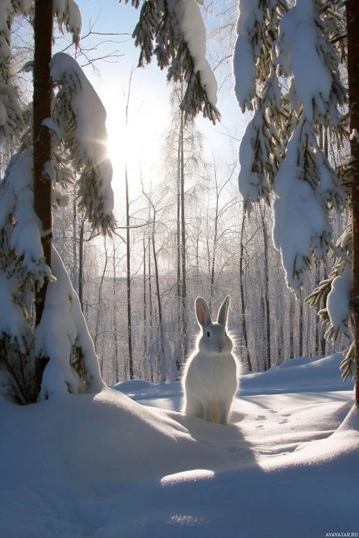 На картинке изображен кролик, стоящий среди заснеженных деревьев. Кажется, что стоит ясный день, солнечный свет пробивается сквозь ветви, заливая все теплым сиянием. На фотографии нет никаких признаков присутствия человека или каких-либо других животных.