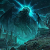 a humanoid body. This creature is often associated with madness and cosmic horror in the Lovecraftian universe. The background showcases a night sky filled with stars, reinforcing the otherworldly or cosmic nature of the scene. The color palette is dominated by dark blues and greens, enhancing the eerie and mysterious ambiance typical of such fantasy settings.