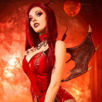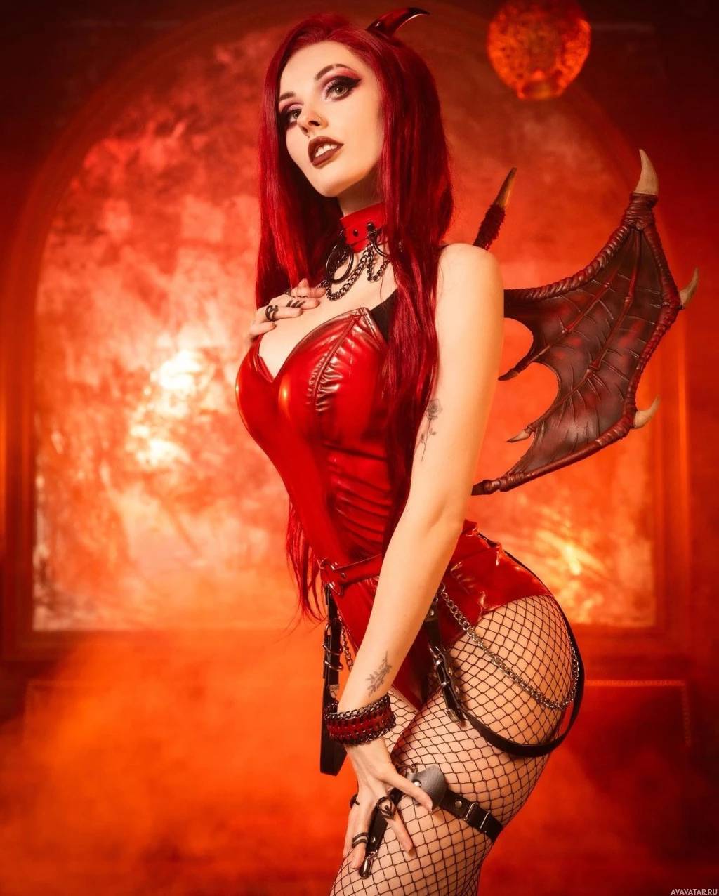 In the image, there is a person who appears to be dressed as a succubus, which is
