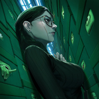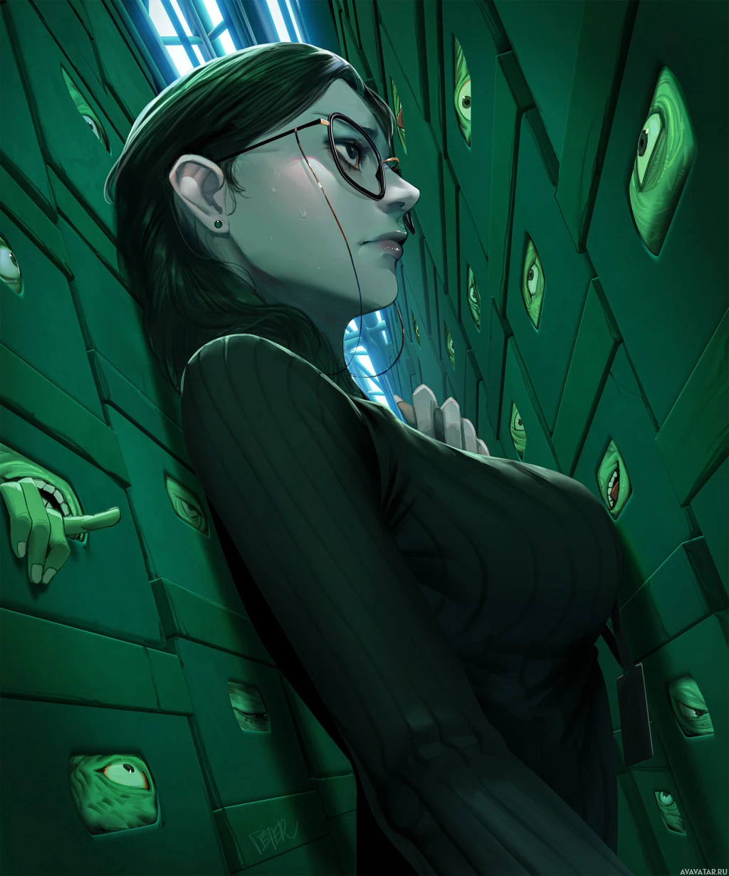 dark hair, wears glasses, and is dressed in a black outfit that seems to have a gothic or edgy style. Her expression is somewhat melancholic or contemplative as she leans against what looks like an array of computer