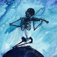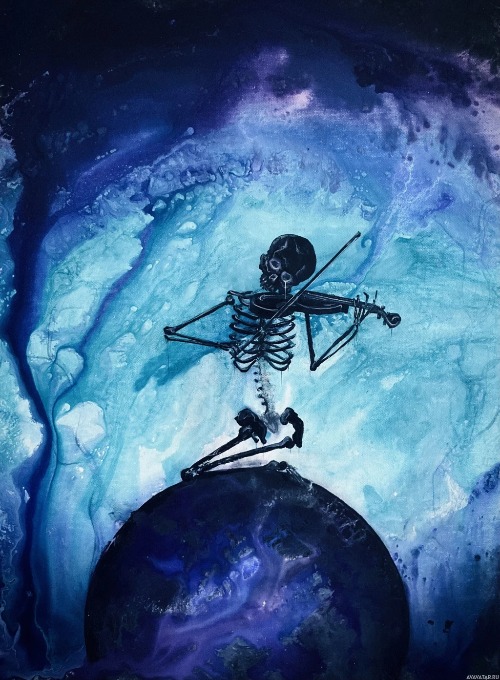 The image shows an artistic painting of a skeleton playing a violin. The background has an ethereal or possibly space-themed appearance, with hints of blue and black, suggesting a celestial or deep