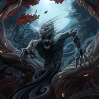 wild eyes, suggesting it may be malevolent in nature. The setting appears to be at night under