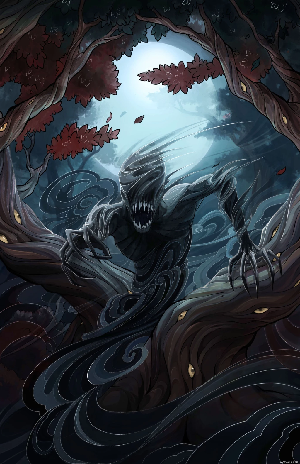 a creature of the night or a supernatural entity, is seen emerging from a large tree with twisted branches and roots that resemble a face or mask. The figure appears ethereal and menacing, with an exaggerated expression and