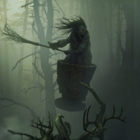 monstrous being, possibly guarding the way or reacting to the witch's presence. The forest around them is dark and eerie, with