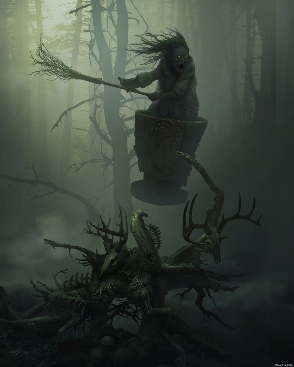 bare trees that suggest it could be autumn or winter. The overall mood of the image is quite ominous and supernatural.