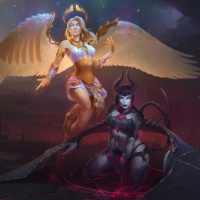 an angelic figure with wings and what appears to be a halo around her head. She has a serene and ethereal look. On the right, there is a succubus character, which is