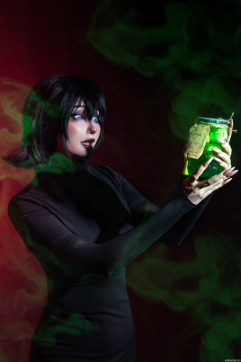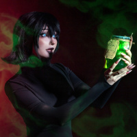 black clothing, and their makeup is designed to enhance their features for the role they are portraying. The background has a red hue with what appears to be green smoke or fog effects around the person's head and hands, adding to