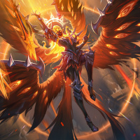 large wings that are spread out wide as if in flight, and the character is holding what looks like a staff with a glowing effect at the top. There's an explosive effect around the staff, suggesting some sort of