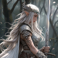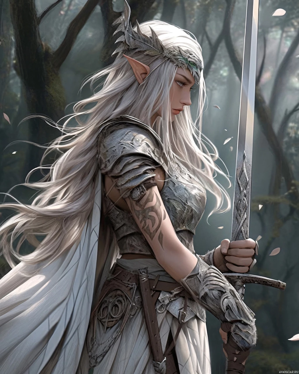 fantasy character, often referred to as an elf in the context of such illustrations. She has long white hair and is wearing armor with intricate details that suggest she might be from a medieval or other historical setting within