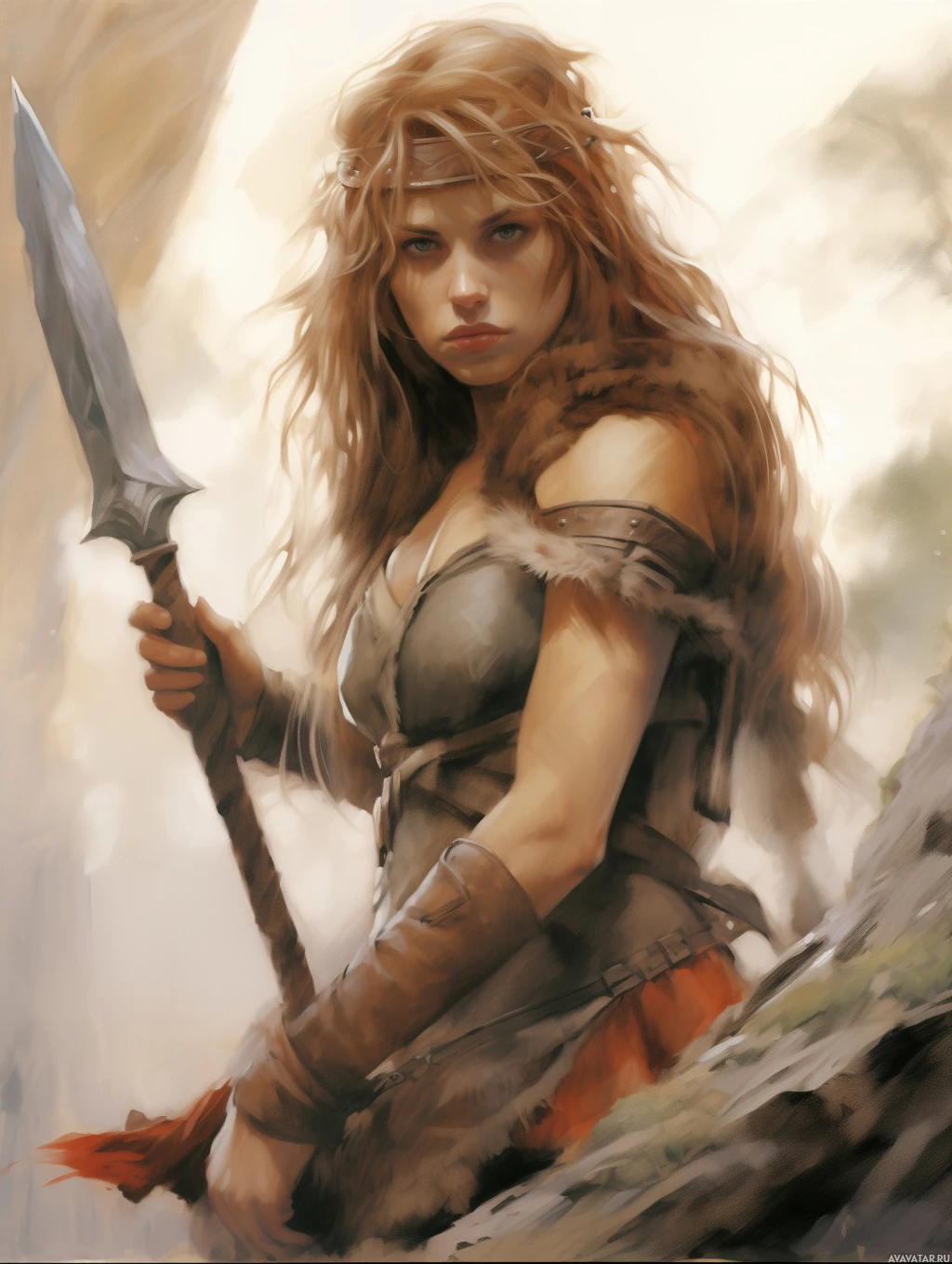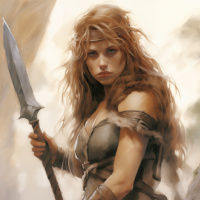 red hair. She is wearing what appears to be ancient or mythological clothing, including a dress and armor that suggest she might be portraying a warrior or a heroine from a historical or fantasy setting. In her hand, she holds a lance or spear, which further enhances the warrior theme of her attire. The background features what looks like natural
