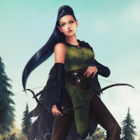 dark hair, wears a tunic and boots that suggest an archery or warrior attire, and is holding a bow in her right hand, indicating she might be prepared for combat or archery. The background shows a forest scene with trees that reinforce