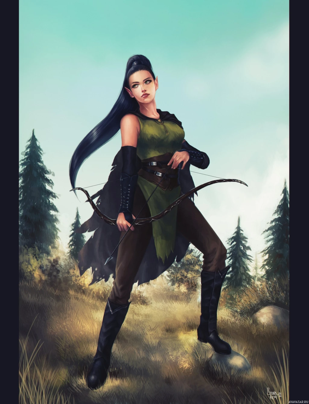 The image depicts a fantasy-themed character who appears to be an elf. She has long