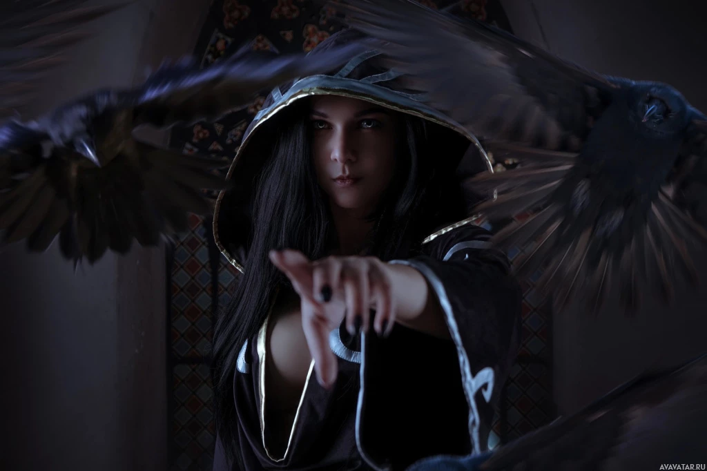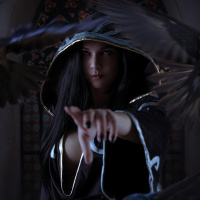 dark hair wearing a cloak or hooded outfit. They have their hand raised in a gesture that could suggest magic or control over the birds around them. The background features what appears to be stained glass windows, which may indicate