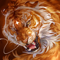 a fierce expression. It has orange and black fur, a prominent ruff of hair around its neck, and is displaying sharp teeth in