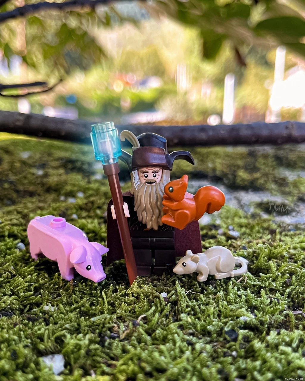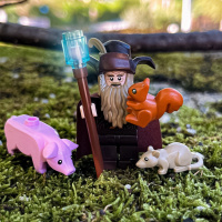 blue crystal on top, which resembles the scepter that Gandalf carries in the movies. Surrounding the figure are several Lego animals: