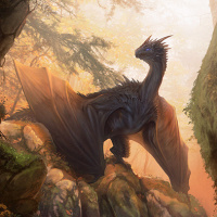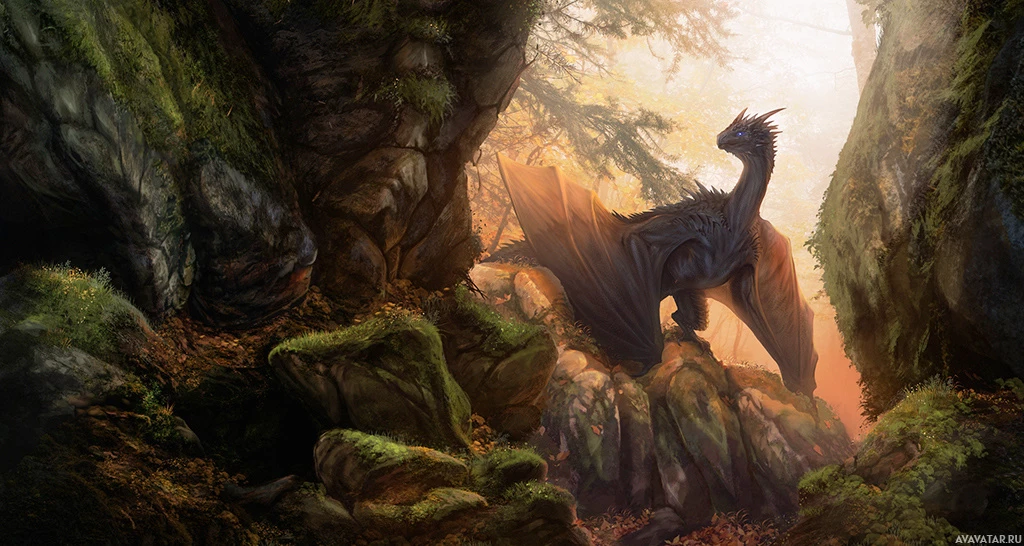 a fantasy scene with a dragon. The dragon is prominently featured in the center, surrounded by lush greenery and