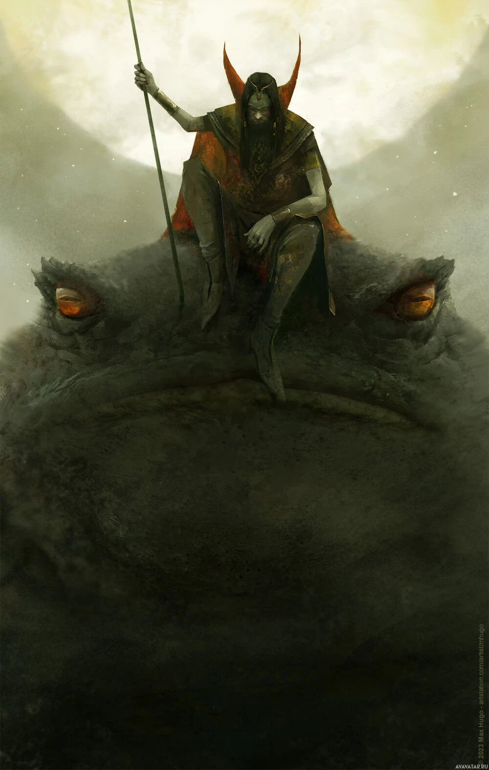 a rocky outcrop, giving off an air of a heroic or commanding figure. On the right side, there is a creature resembling a toad with large