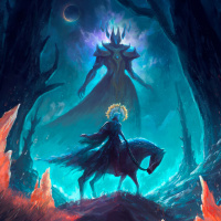 demonic figure stands at the end of the path, emitting an ominous aura, which indicates its malevolent nature. The overall atmosphere of the image is dark and ominous, fitting for a fantasy or horror genre depiction.