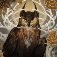 The image features an owl as the central figure. It's a fantasy artwork with intricate details and a vibrant color palette, including elements such as flowers and deer antlers in the background. The style is reminiscent of traditional illustrations found in medieval manuscripts or modern fantasy book covers.