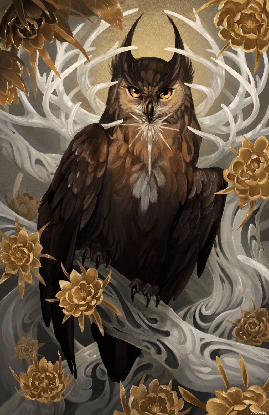 Центральной фигурой на изображении является сова. Это фэнтезийное произведение искусства с замысловатыми деталями и яркой цветовой палитрой, включая такие элементы, как цветы и оленьи рога на заднем плане. Стиль напоминает традиционные иллюстрации, которые можно найти в средневековых рукописях или на обложках современных книг в жанре фэнтези.