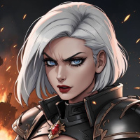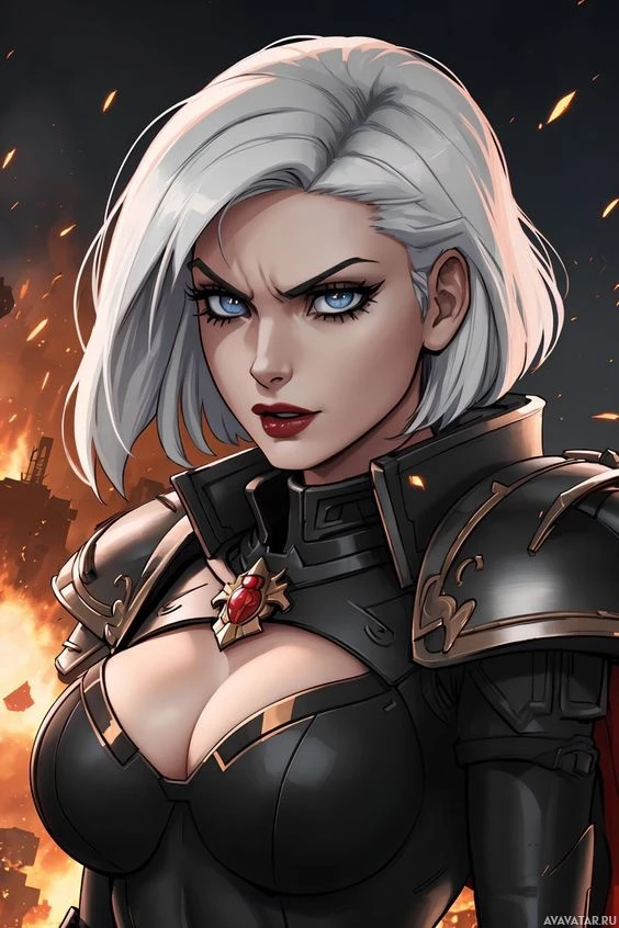white hair, a stern expression on her face, and is dressed in a costume with armor elements and what looks like a cape. Her attire and overall appearance suggest she might be a protagonist or heroine within the context of her storyline.