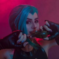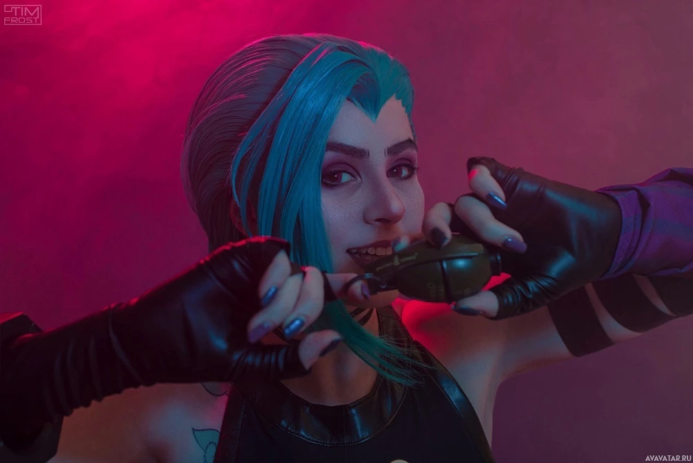 The image depicts a person cosplaying as Jinx from