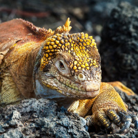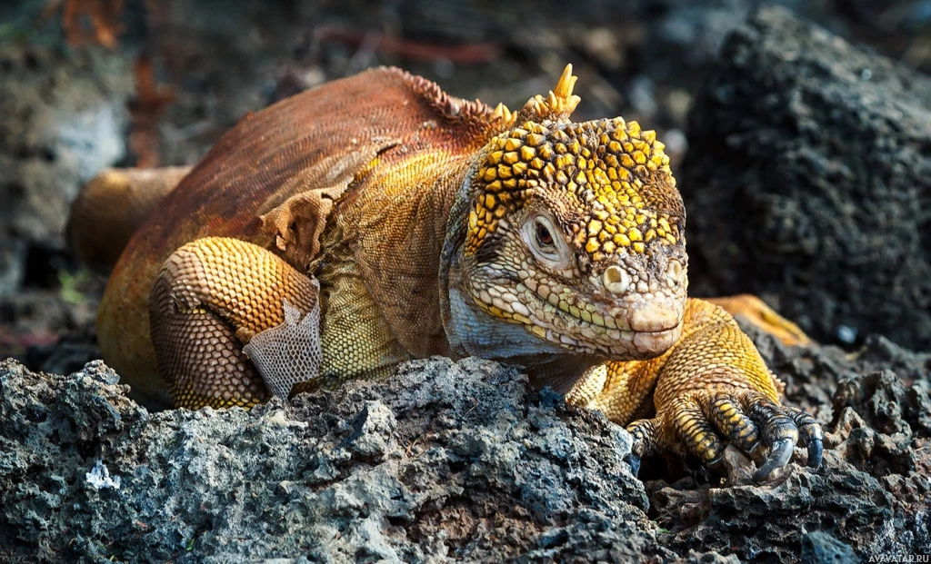 scaly skin and ability to camouflage itself with the environment. The iguana is sitting on