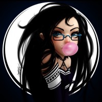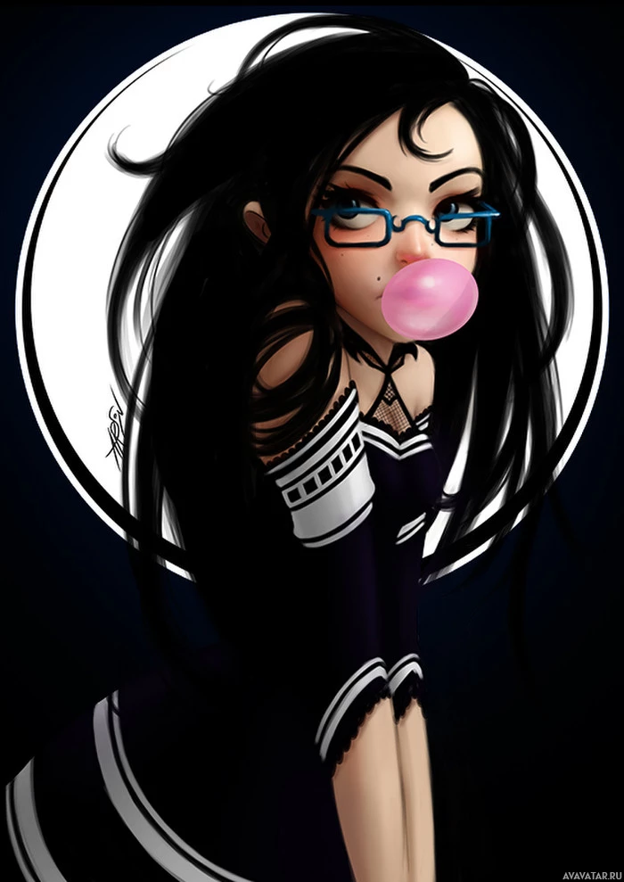 a female character who appears to be wearing glasses, a dark dress with some light-colored detailing, and has long black hair. She is blowing bubbles with her gum and is positioned in front of