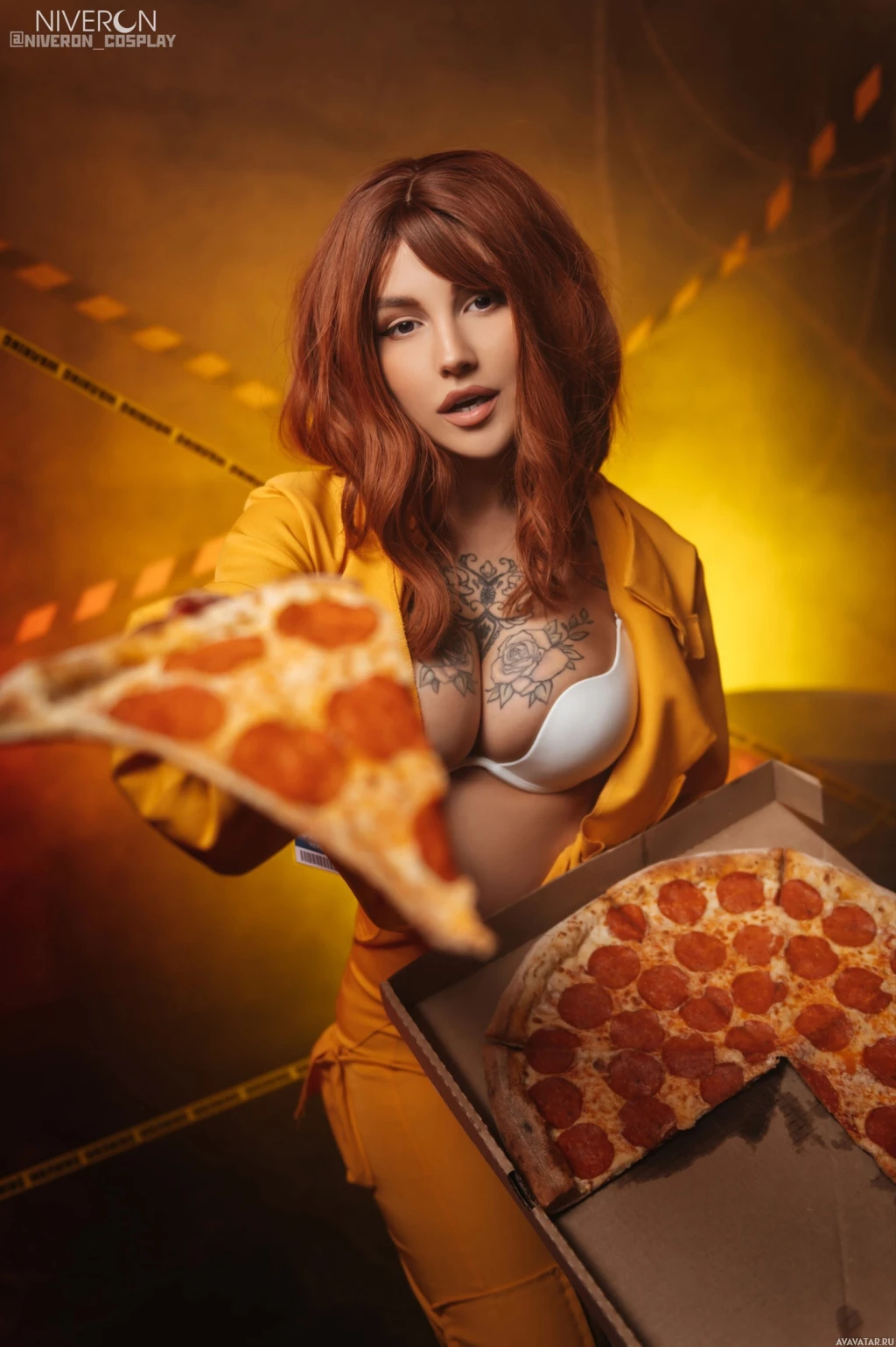 a cosplay setting. She is wearing a yellow outfit and has her hair styled in such a way that it stands up, which could suggest she is portraying a character from anime or some other form of