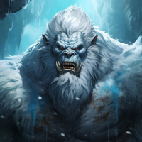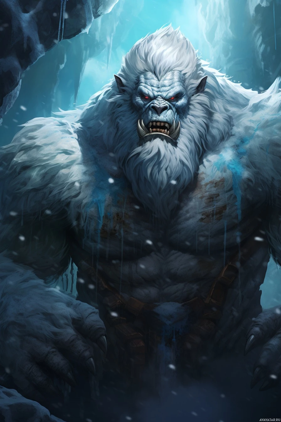 The image features a fantasy artwork depicting an intimidating creature resembling a hairy, muscular humanoid with a fur-covered body and prominent facial features like a thick beard and