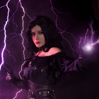 the character for fun or at a convention. The character is holding lightning bolts around her and seems to have control over them, indicating that she has