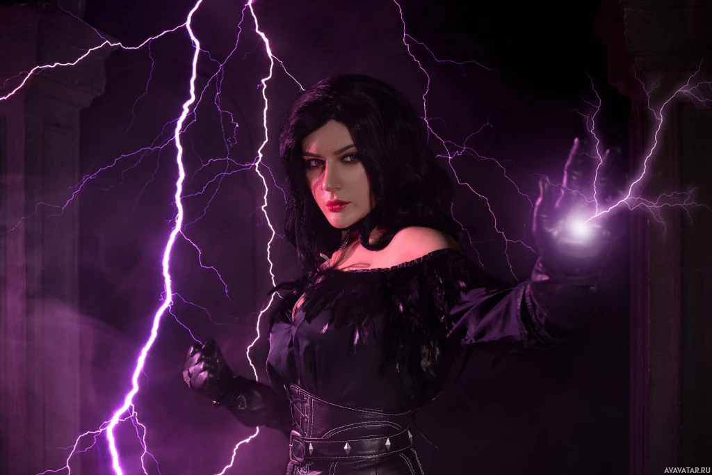 the video game "The Witcher 3: Wild Hunt." She is portrayed in cosplay, which means she is dressing up as