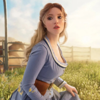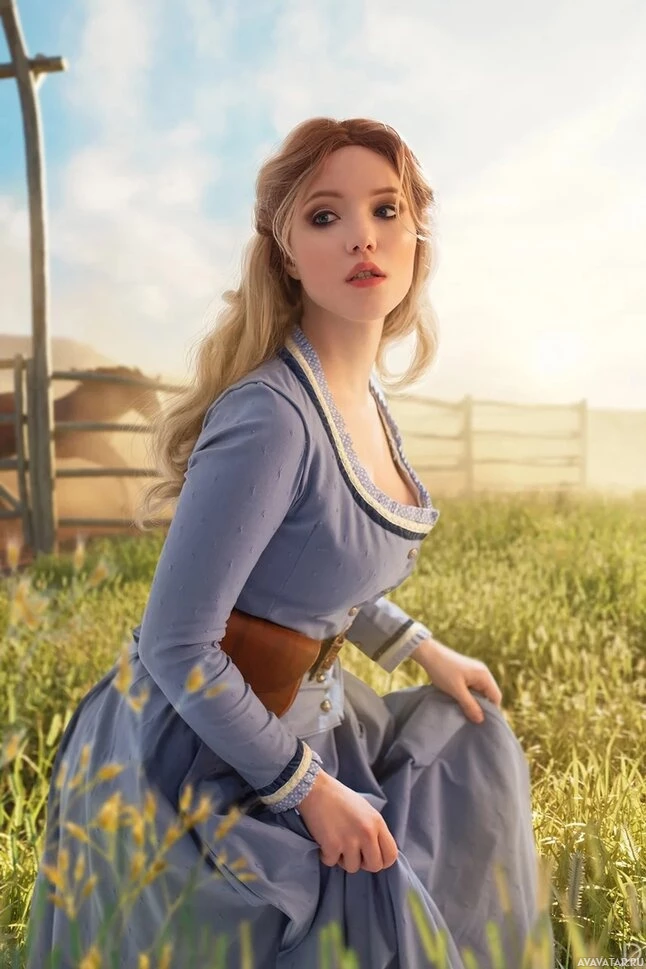 a young woman with blonde hair, wearing a dress that suggests she might be in the style of a historical or fantasy setting. She has an expression that could be interpreted as one of surprise or curiosity. In the background, there are elements such as hay bales and what appears to be a farm structure, indicating