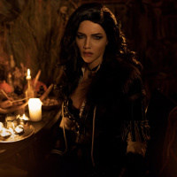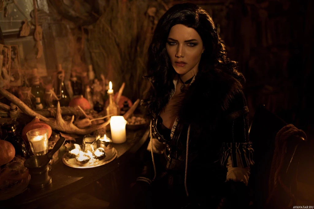 an intense gaze, dressed in a costume reminiscent of Yennefer from the "The Witcher" game. She is seated at a table with candles that provide